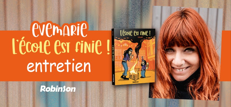 Ayant adoré l’album ‘L’ECOLE EST FINIE’ édité par ROBINSON, une BD tout juste sortie, nous nous sommes dit que ce serait dommage de ne pas en profiter et d’essayer d’avoir un entretien avec EVEMARIE son autrice !